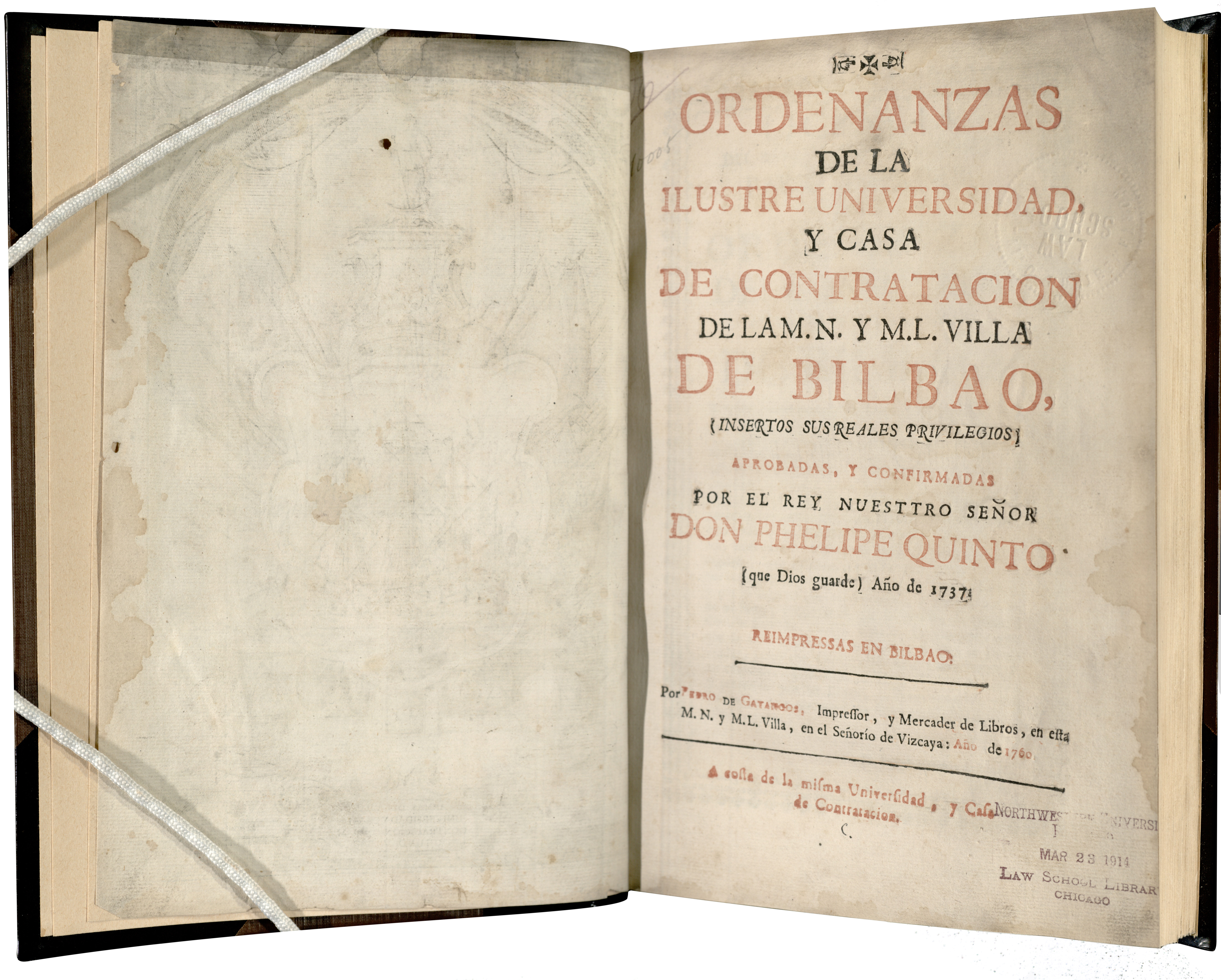 This picture is taken from the preliminary matter of Ordenanzas de la ilustre Universidad, y Casa de Contratacion de la M.N. y M.L. Villa de Bilbao, a book of Spanish commercial and maritime law under King Philip V (although our copy, from 1760, was printed after Philip’s death). While the pages are decorated with a pretty scalloped border, the engraved image at the very beginning of the book is its only illustration.
