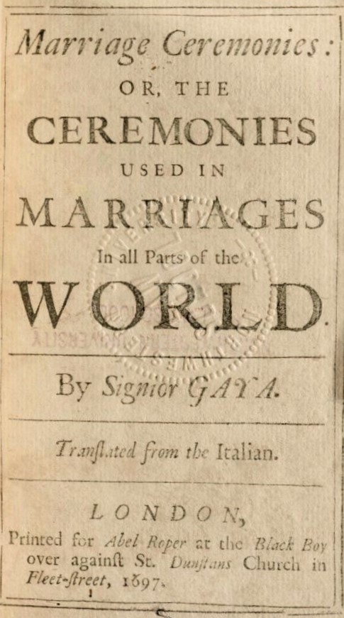 In the preface, the author writes: “Marriage is not solemnized in the same manner every where but the Rules and Laws of Marriage are more or less strict, according to the Diversity of Religions and Nations. […] Yet, among all the different Laws and Customs in the World, there is no Nation so Barbarous, as not to solemnize Marriage with some Rites, Ceremonies, and publick rejoicings.” In 11 chapters, this little book examines the traditions of at least as many religious groups, albeit through Gaya’s very Catholic lens.