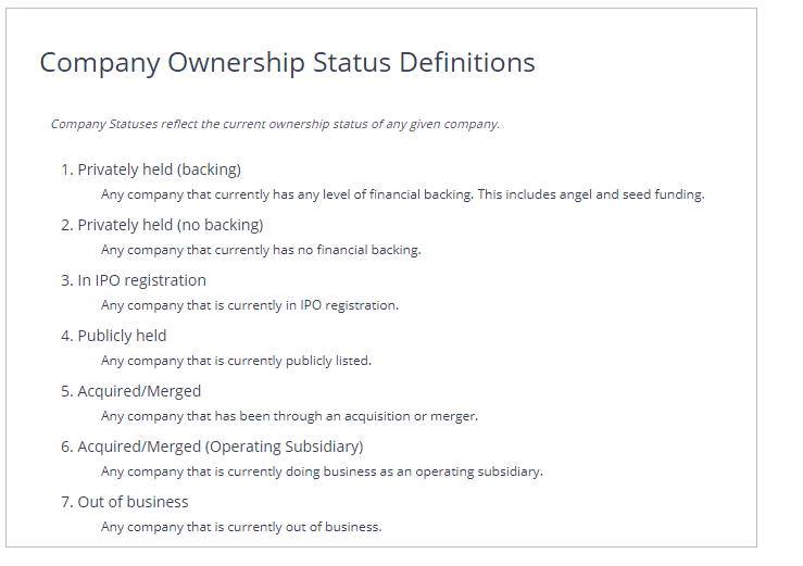 As you’re clicking into different areas or trying to search the voluminous information in PitchBook, you’ll likely encounter unfamiliar terminology. Just like Westlaw, Lexis, and other academic databases, there’s an “i” icon next to certain fields (e.g. above the open text field on the industry page) that will provide you with more details pertinent to that specific field, such as the scope of what’s included, the functionality of that feature, or definitions. You’ll see this “i” icon when using advanced keyword searching. For example, see the screenshot below of “Ownership Status”. Clicking the “i” takes you to definitions of each type of status. This extra information will quickly guide you in more effective and accurate searching. Pro tip: check the “i” icons in any database when you see them; it usually takes less than a minute to review and has helpful information specific to what you’re doing.
