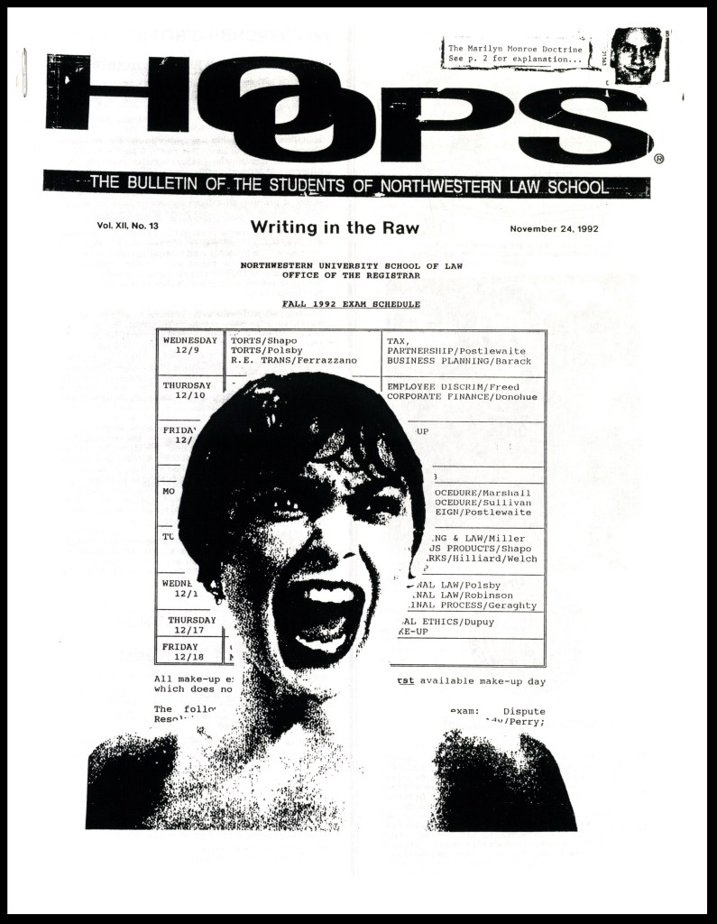 The Letters to the Editor sections gave the larger law student body a context in which to discuss law school issues large and small, serving as an analogue social media platform specific to the Law School. Among many other topics, students frequently shared their opinions on their courses; these letters were required to be signed by their author, but the lack of anonymity did not seem to deter students from strongly wording their critiques. A contemporary reader may wonder if these students would be as willing to speak out in a face-to-face classroom setting as they were in The Pleader or HOOPS; like in an online forum or comments section, the removed context of the newsletter may have offered students the freedom to speak more candidly, especially in a newsletter by and for their peers. Despite their student focus, these newsletters were not simply echo chambers for student opinion: as The Pleader gained popularity (and perhaps notoriety) on campus, it also became widely read among faculty and administration members, including those on the receiving end of student criticism. The newsletters allowed such faculty members to respond to criticism that had been printed in previous issues, and dialogue often developed in the Letters to the Editor section from issue to issue. Perhaps because the student-run newsletter prioritized the student voice above any other, students often had the final word in such printed exchanges that involved authority figures like professors.