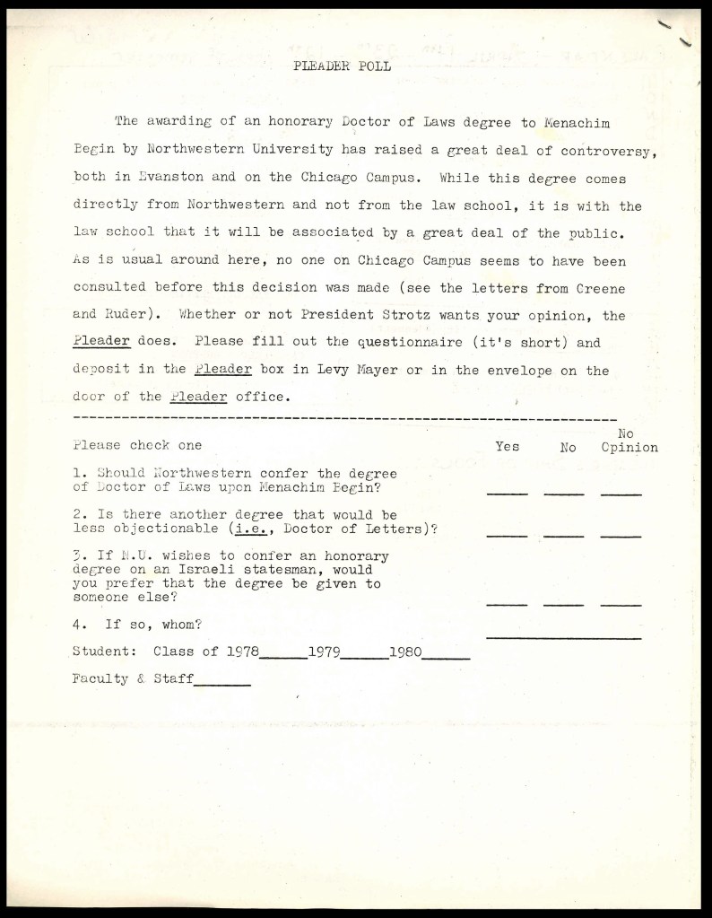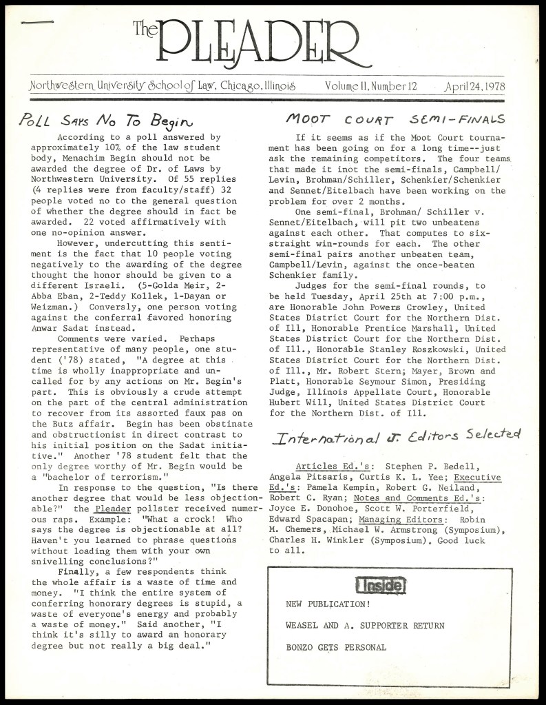 Many of these writers focused on news specific to the law school, like statements from the dean, but others responded to contentious events that affected the Northwestern community on a whole. In an April 1978 issue of The Pleader, the editors addressed Northwestern’s decision to grant an honorary degree to Israel’s Prime Minister. In response to this event, the editors printed several letters from law students criticizing this decision and released a poll inviting students to submit their opinion on the honorary degree conferral. Printing the results of the poll in the next issue, the editors of The Pleader demonstrated a desire to affect institutional change democratically by collecting and disseminating student response.